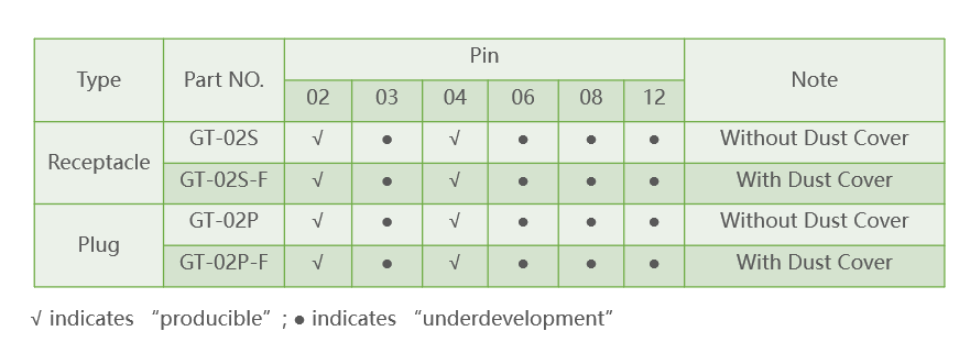 Greenconn's GT series connectors come with different pin numbers and plug/socket types, including options with dust covers or without, to cater to different application scenarios. For details, please refer to the following specification diagram and selection table.