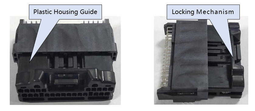 Figure 2:The plastic housing guide and locking mechanism features of automotive PCB header connectors