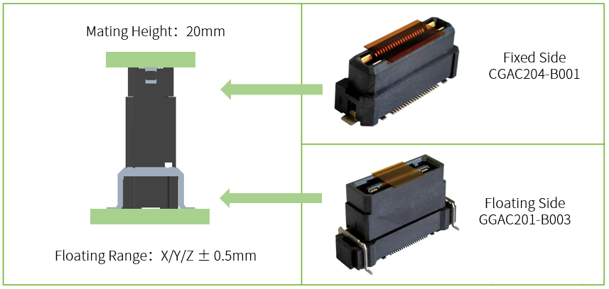The GC04 series floating connector consists of a floating end (GGAC201-B003) and a fixed end (CGAC204-B001). These two ends can hold a maximum stacking height of 20mm and allow a floating range of 0.5mm in the X/Y/Z axes directions, ensuring a stable and reliable connection. The surface-mounted weld tab, power pins, and signal pins create a compact structure that is perfectly suited for applications in confined spaces and harsh environments.