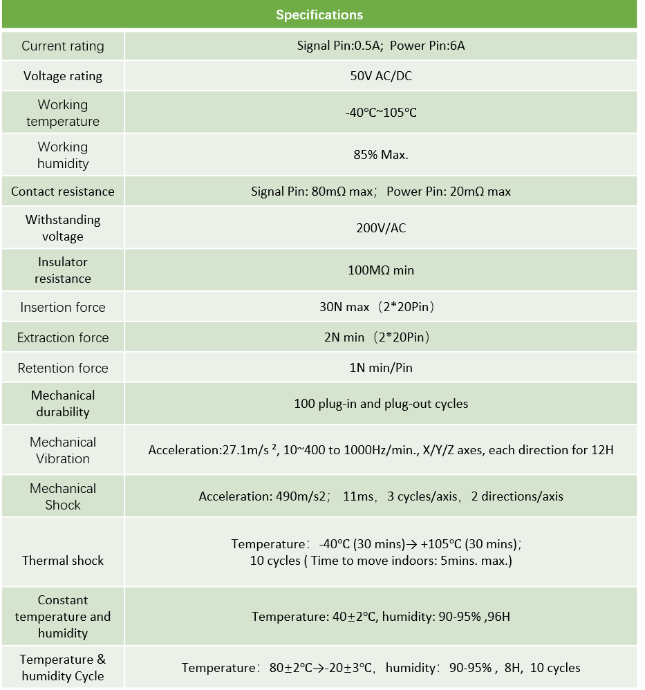 - Contact Surface Plating Material: Nickel 1.27um; Mating Area, Gold ≥0.1um; Welding Plate Area, Gold 0.02um