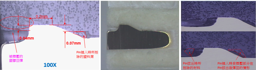 图二为倒刺与塑胶材料干涉时在显微镜下呈现的情形。当pin插入时,会将材料括除堆积在两侧及前端;当pin插入到位后,受挤压的材料会弹回,但回弹后的塑胶无法回到原来状态﹐ 只是部分回弹﹐弹回量约0.04mm(干涉量为0.07mm时);拔出过程中,倒刺会括除弹回的材料;倒刺插至终点时所挤压的材料在倒刺拔除时会弹回; 当Pin完全拔出后﹐与Pin配合的塑胶槽因为倒刺将材料括除而变大﹐此时再插入端子﹐其保持力将大大减小。所以﹐使用过的塑胶无法重复使用。