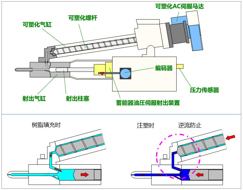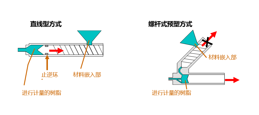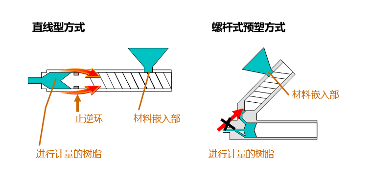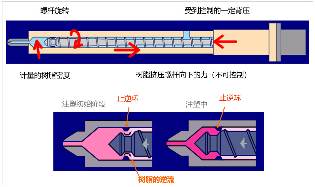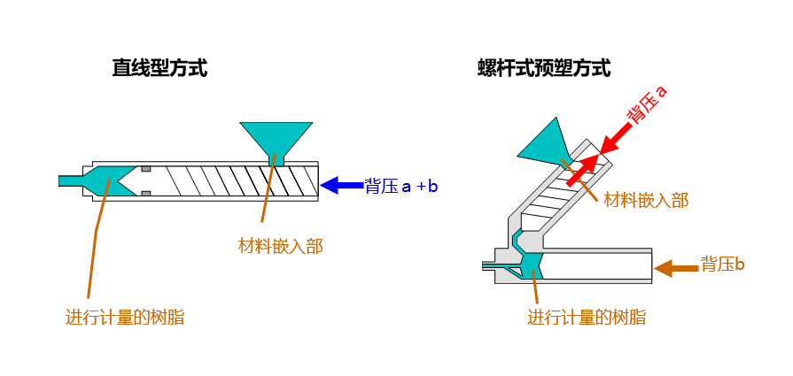 在直线型方式的情况下,树脂挤压螺杆向下的力量与受到控制的背压之差决定了计量树脂的密度。在树脂状态下,其密度会受背压的大小影响发生变化。